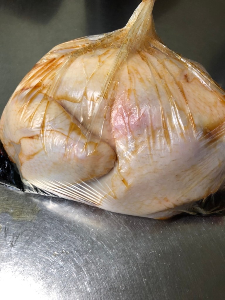 ① 丸鶏をビニール袋に入れ、醤油・みりん・オリゴ糖シロップをよく混ぜ合わせたものに漬けこむ。2日ほど冷蔵庫に置く。途中鶏を転がし、満遍なく味を染み込ませる。