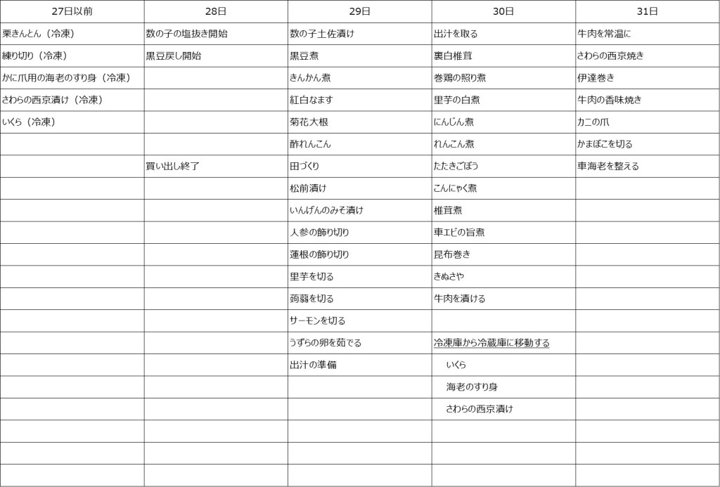 スケジュールは一覧にして、28日には印刷して、終わるたびに✓を書いて漏れがないようにしています。それぞれの作り方は「おせち料理」のリンクからご確認ください。