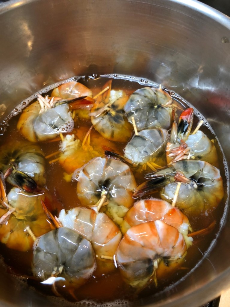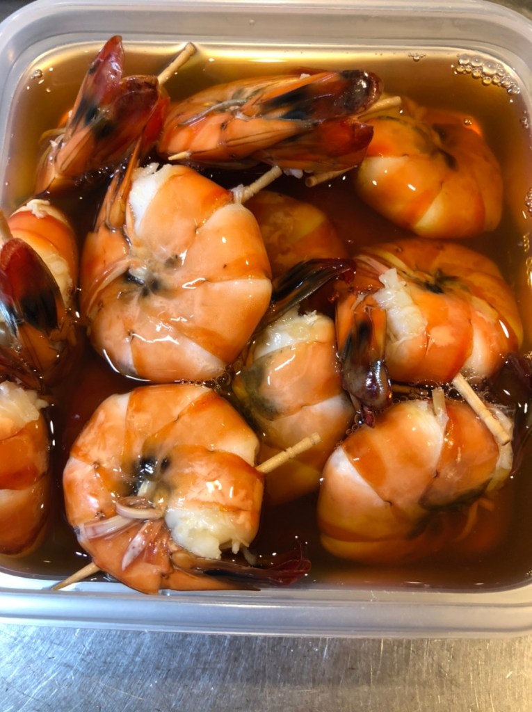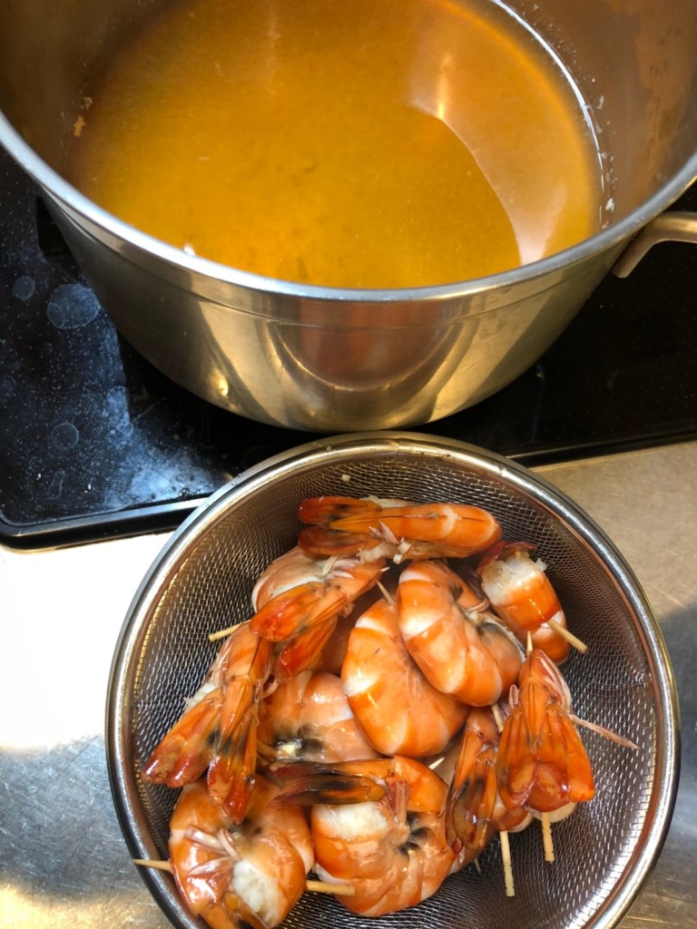 ⑥ 海老と汁が冷めたら、海老を汁に漬けて、冷蔵庫で1日置く。