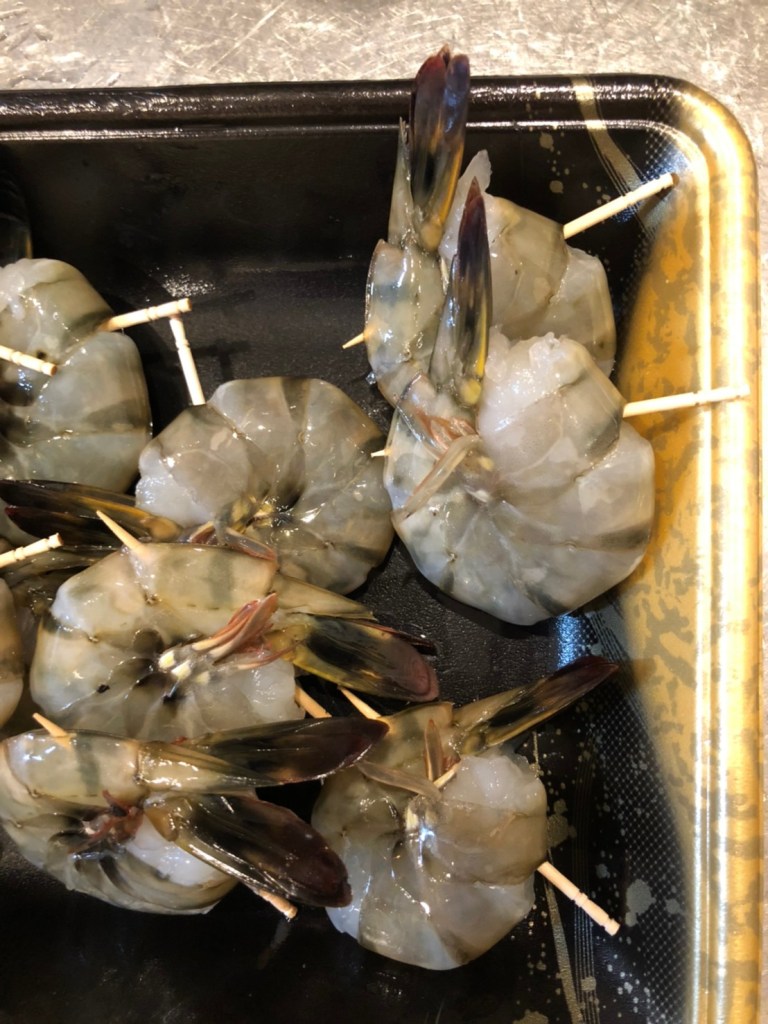 ② 爪楊枝や竹串で海老を丸めて頭に近い部分と尻尾に近い方を刺して留める。