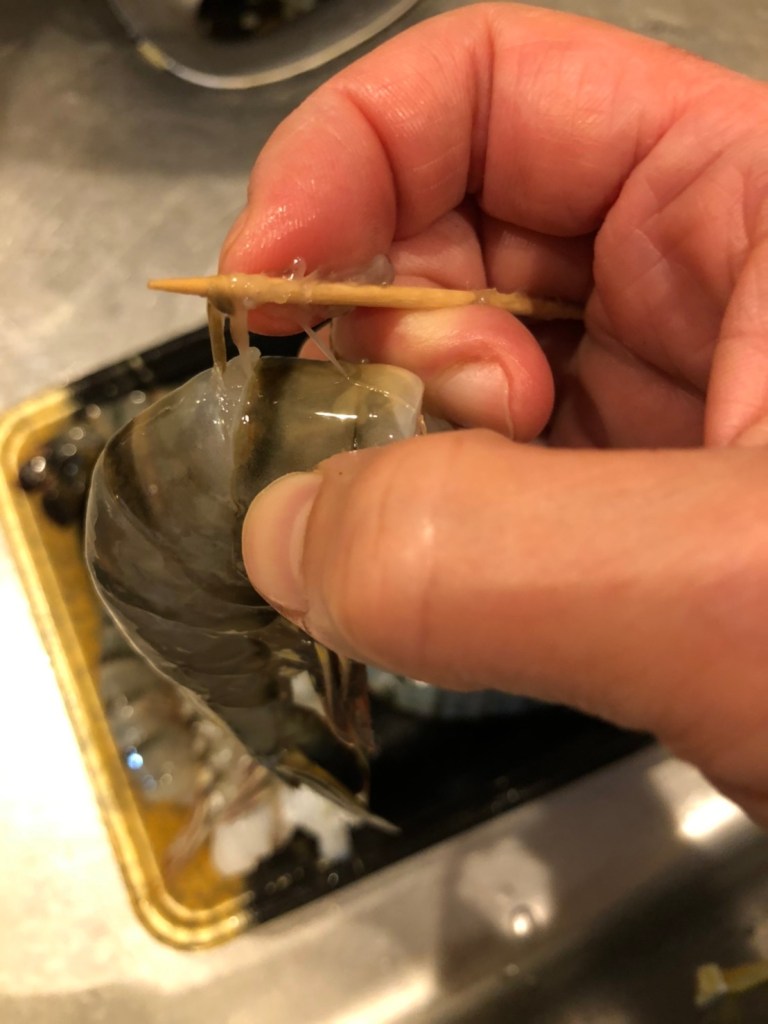 ⑦ 食べる前に海老の殻をむき、両端を切り落とす。